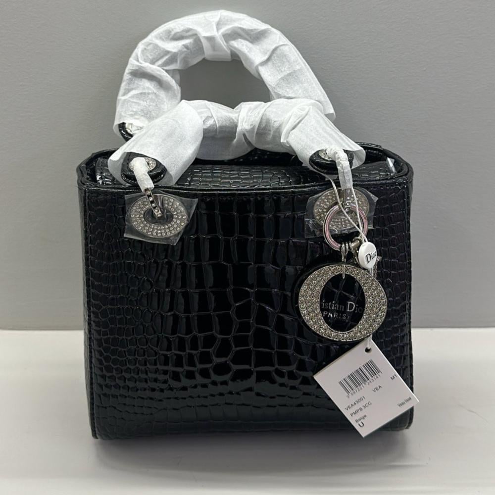 حقيبة ليدي ديور بالجلد الاسود الكلاسيك ، بنقشة جلد الثعبان اللامع مزينة بتعليقات كرستال فضي بحروف ديور