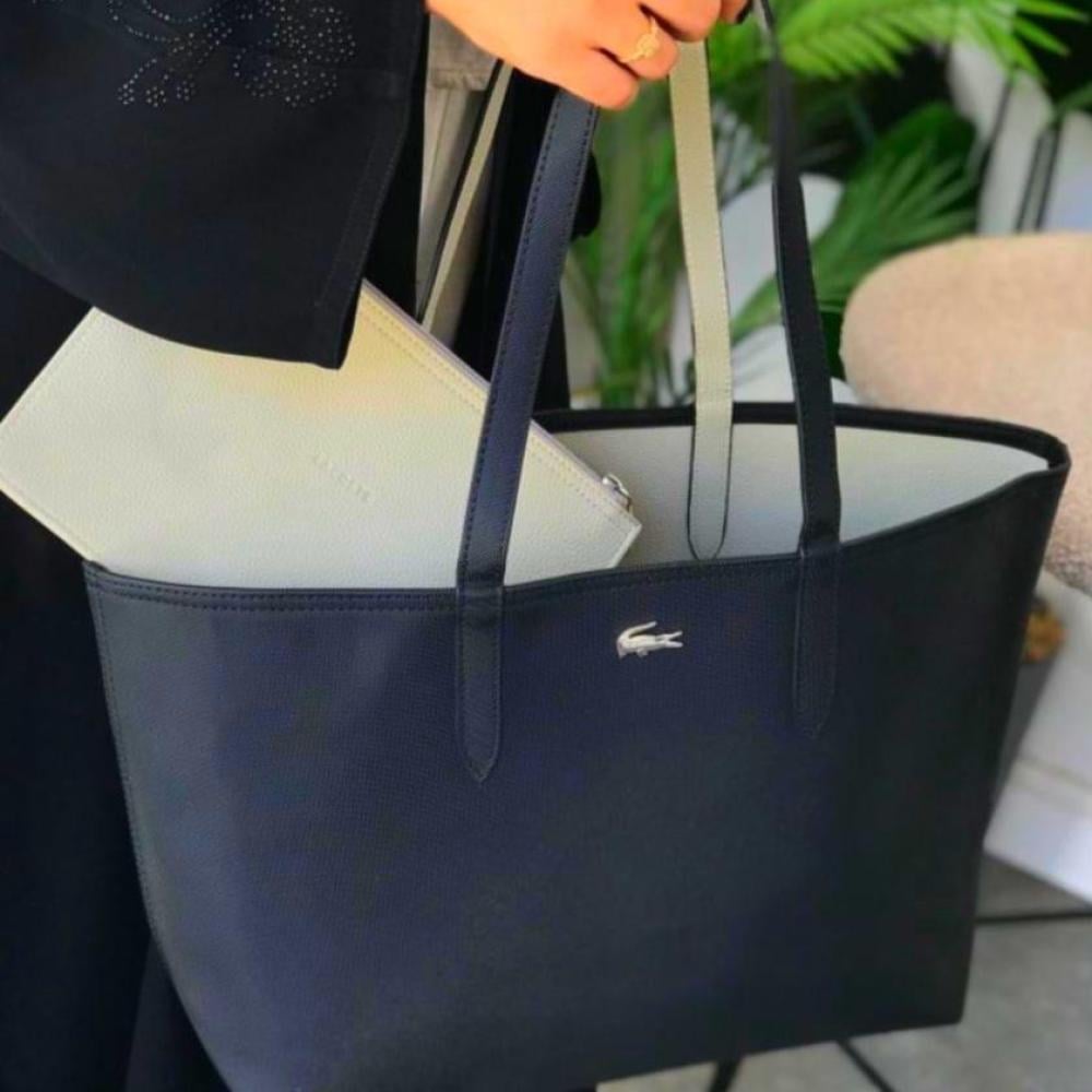 حقيبة Lacoste Anna Reversible Tote تجمع بين الأناقة والعملية، مصنوعة من قماش PVC الفاخر المقاوم للماء، بحجم واسع مثالي للاستخدام اليومي، مع حقيبة داخلية صغيرة تضيف لمسة راقية وعملية.